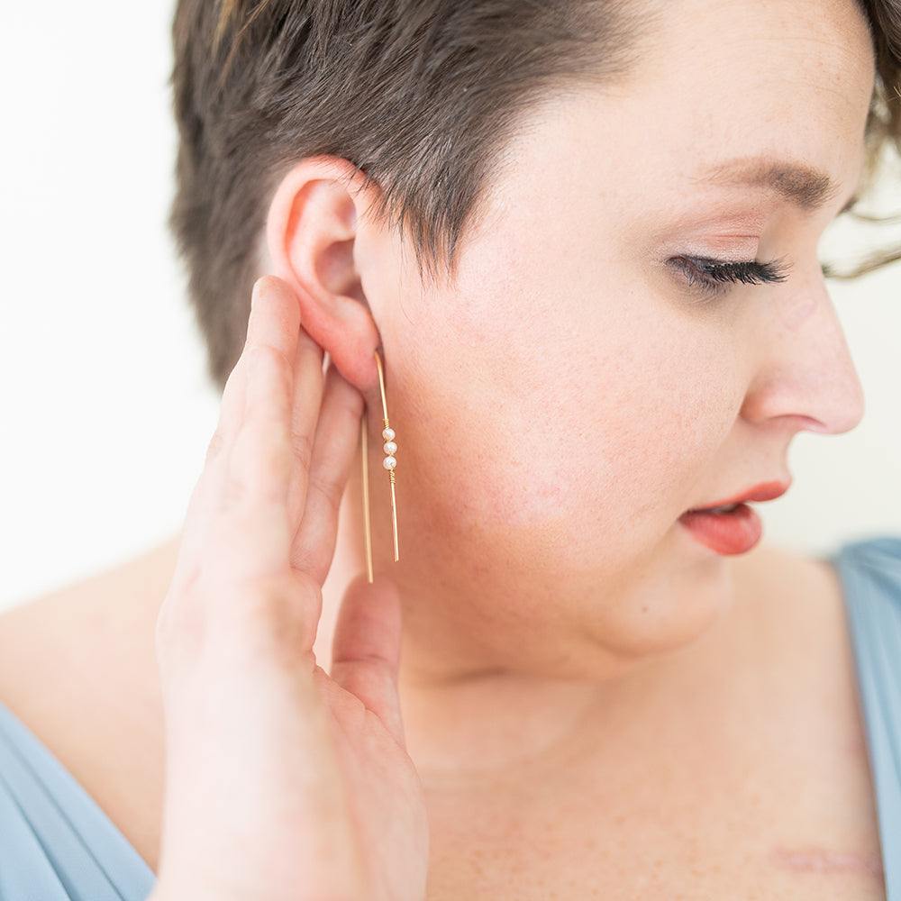 Introducing the Lea Dainty Pearl Drop Earrings! These beautiful earrings are perfect for any occasion. They're sophisticated and elegant, and they add a touch of glamour to any outfit. Three delicate pearls are hand-wrapped around carefully arched 14k gold filled wire, and they make a stunning addition to any wardrobe.